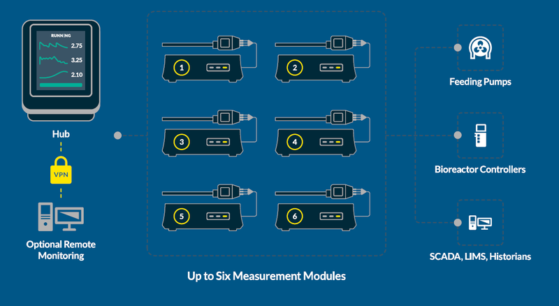Connect up to six measurement modules to a single MAVERICK hub to monitor process conditions and control feeds across multiple bioreactors independently and simultaneously in real-time. This setup saves valuable bench space and boosts efficiency.
