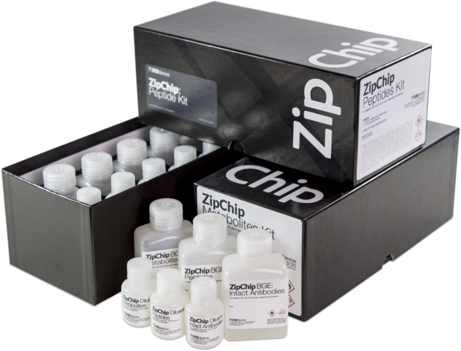 ZipChip consumables are preformulated with minimal method development requirements. BGE comes in various pH to match charge state requirements for migration. Chips are the heart of the separation.
