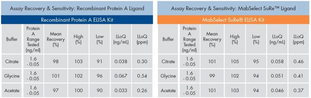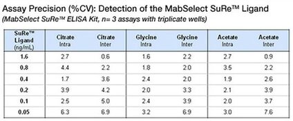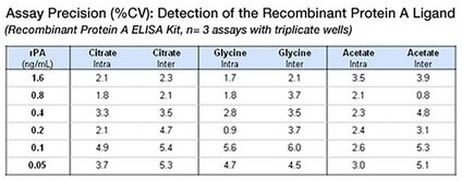 The data above were acquired using the Dilute & Go method. In all cases the sample buffer/hIgG matrix was tested in triplicate at 6 different Protein A concentration levels in three independent assays. The precision (inter and intra assay) was determined for both the Recombinant Protein A and MabSelect SuRe™ kits. The common buffers used were 100 mM Glycine, 100 mM Acetate, and 100 mM Citrate. All buffers were prepared at a pH of 3.0 and neutralized to pH 7.6 with Tris-base. Each contained 5 mg/mL of human polyclonal IgG.