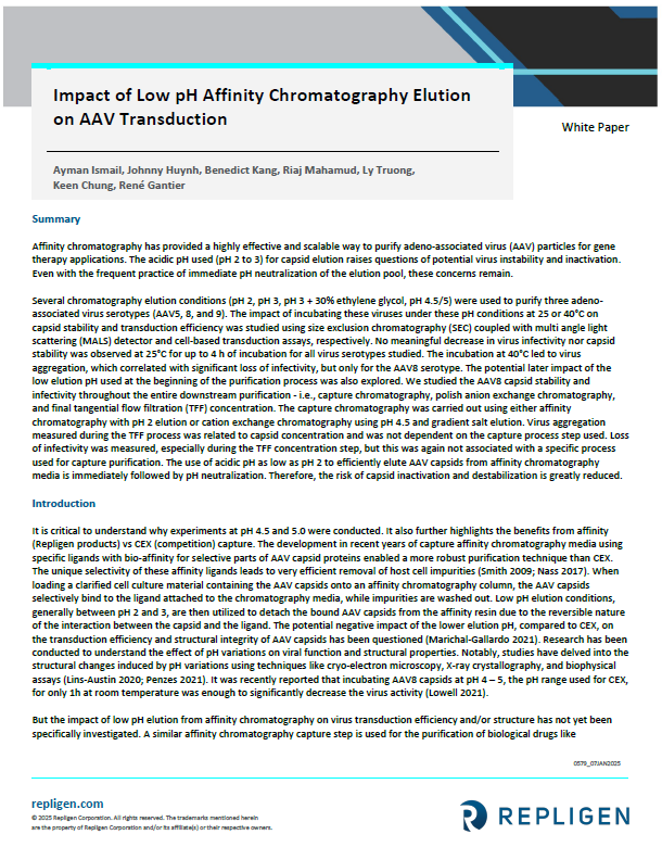 Affinity chromatography enables effective AAV purification for gene therapy, but the use of acidic pH (pH 2–3) for elution raises concerns about virus stability. Studies across different pH conditions and temperatures showed minimal impact on infectivity at 25°C, with some aggregation and loss of infectivity for AAV8 at 40°C. Throughout downstream purification, virus aggregation was linked to capsid concentration rather than the capture process, and immediate pH neutralization after elution helps mitigate stability risks.