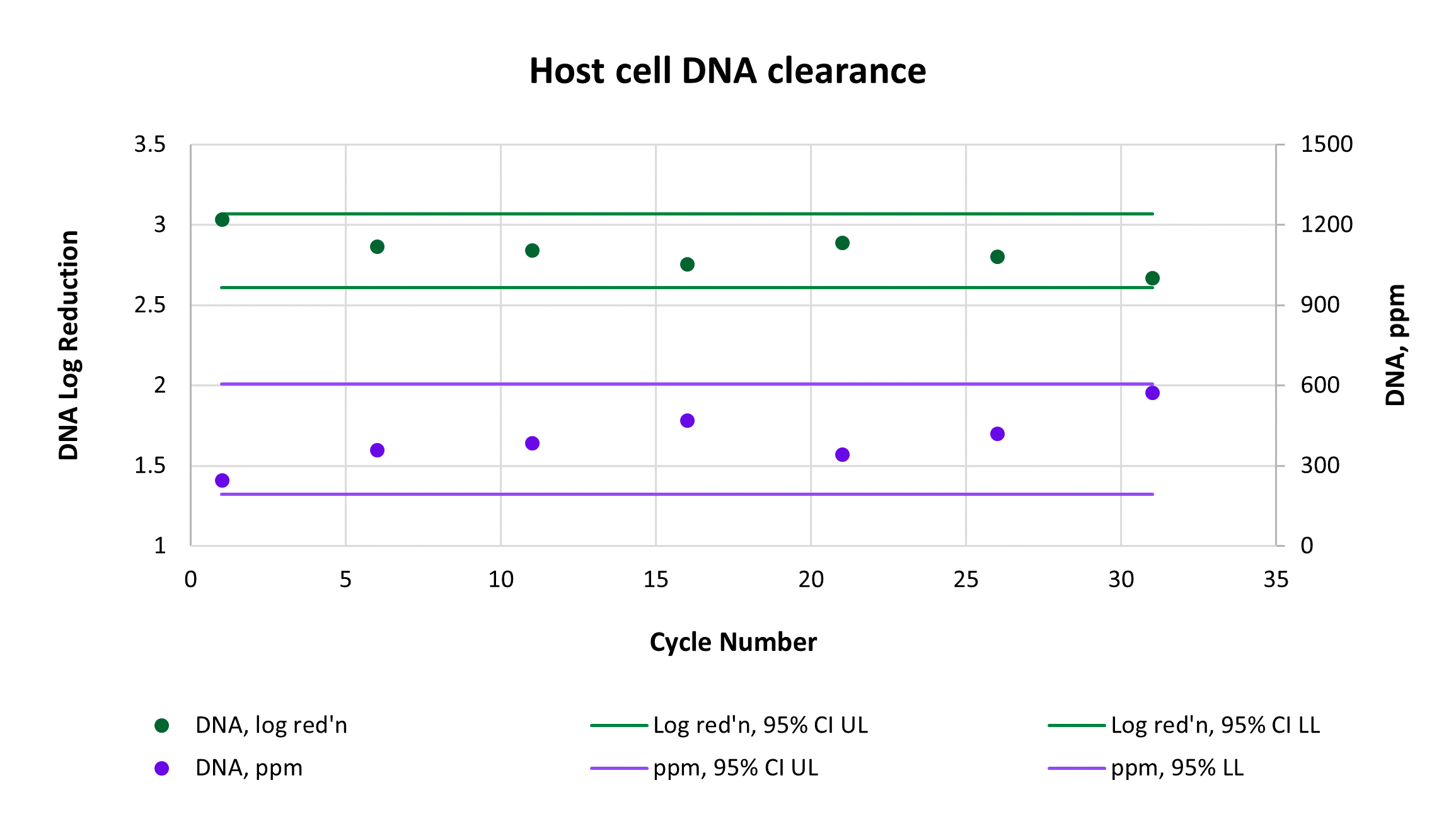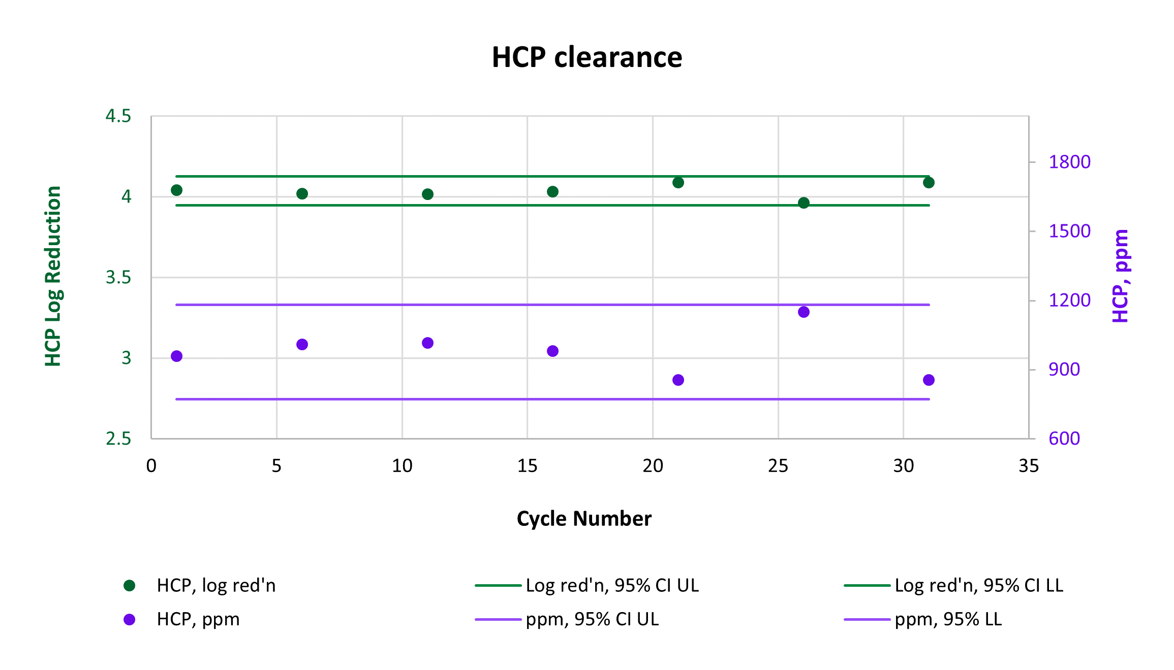 - Maintain high host cell protein (HCP) clearance and residual DNA clearance levels after 20 cycles