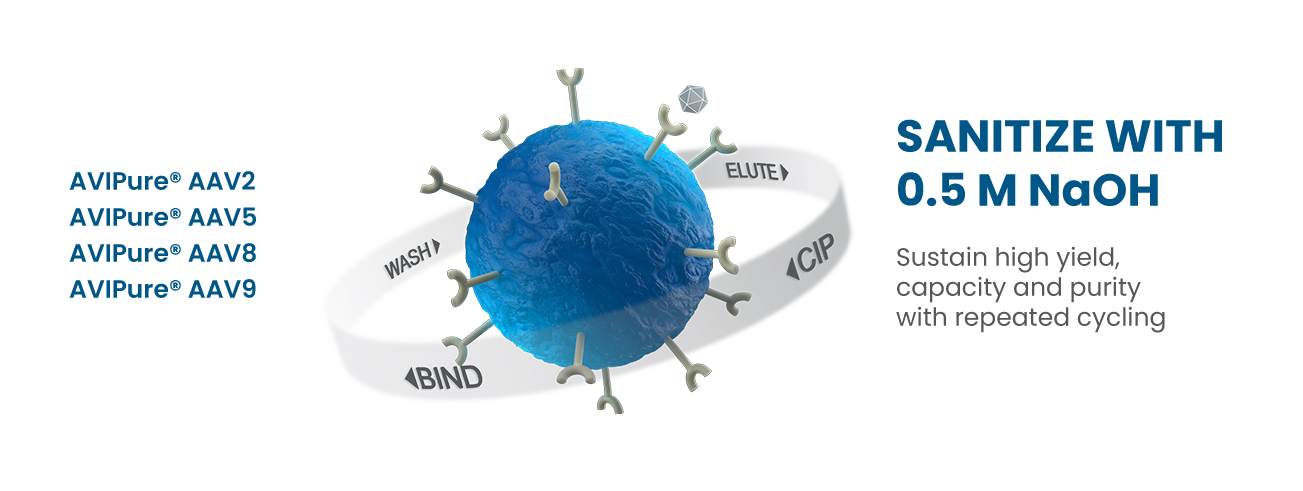 AVIPure® AAV 2, 5, 8, and 9 Affinity Resins meet or exceed the performance metrics of resins developed on alternative platforms with the additional benefit of robust alkaline stability. Affinity resins offer the ability to simplify downstream processing. NaOH stable affinity resins simplify processes and dramatically improve overall process economics.