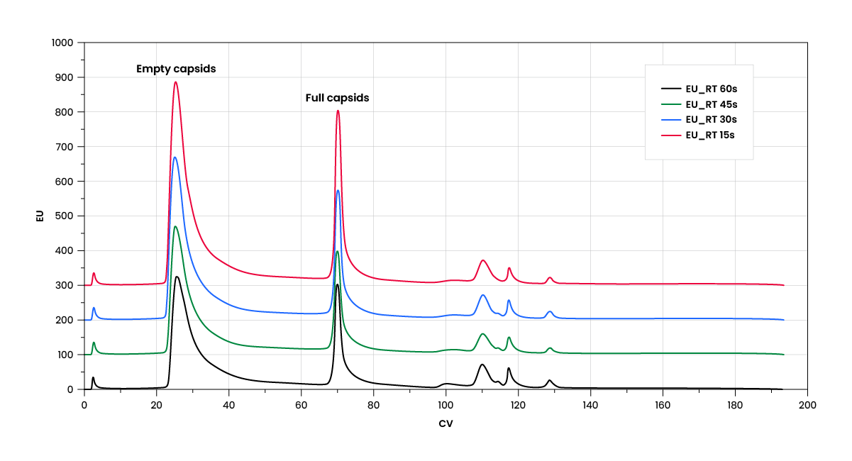 HiPer™ QA resin performance across flow rates at 15-, 30-, 45-, and 60-sec residence times. Performance is unaffected by flow rate, maintaining excellent separation efficiency with no obvious degradation of AAV capsids.