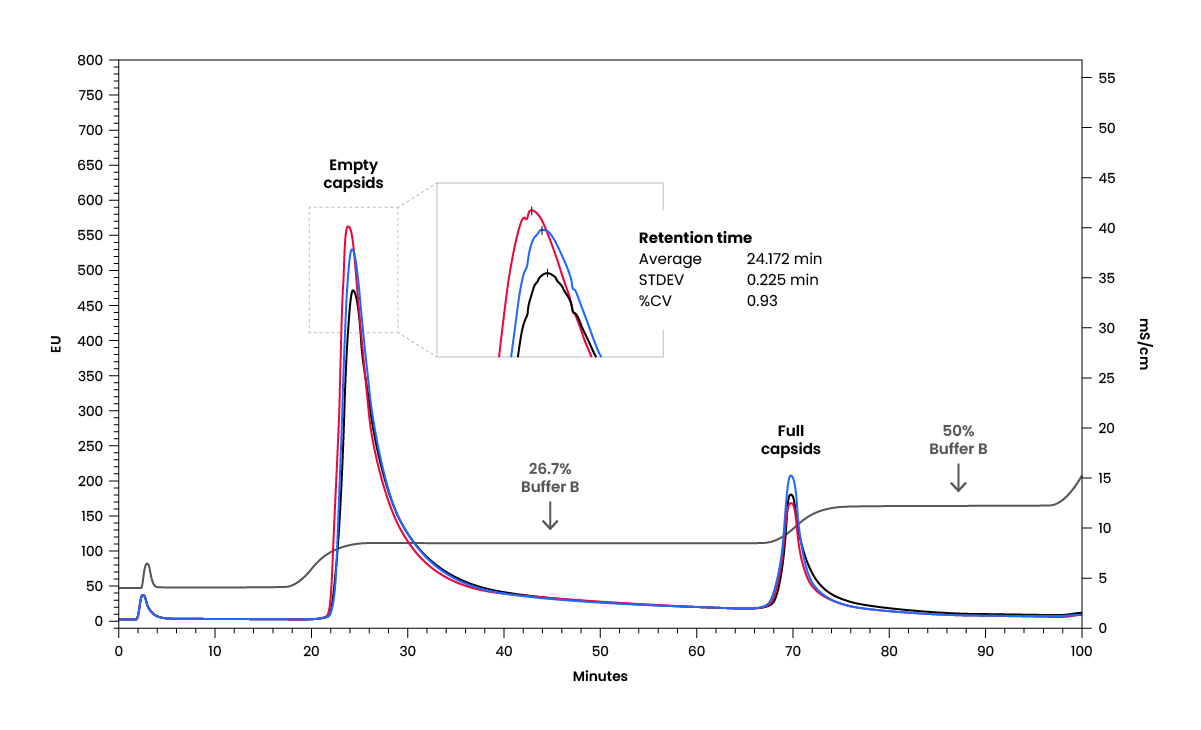 To verify batch consistency, three different lots of the HiPer™ QA resin were tested. First, HiPer™ QA resin was selected from one of three lots and separation of empty and full AAV capsids was performed using a linear elution method. Then, a two-step elution was set up basing on the elution conductivity of empty full AAV capsids from the chromatogram of linear elution. When the same step elution method was applied to columns packed with two other PV lots, we observed similar empty & full capsids retention times, full capsids purity (A260/280), and yield (full capsid peak integration).