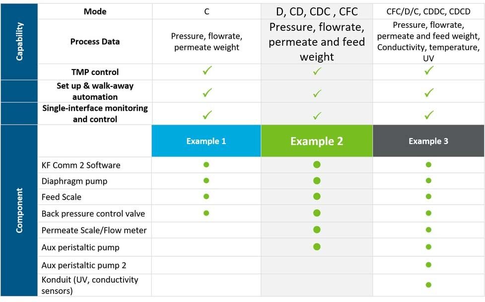 - Configure a minimal number of components for simple applications such as concentration (C) or diafiltration (D)