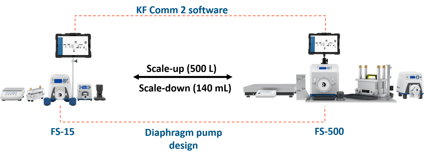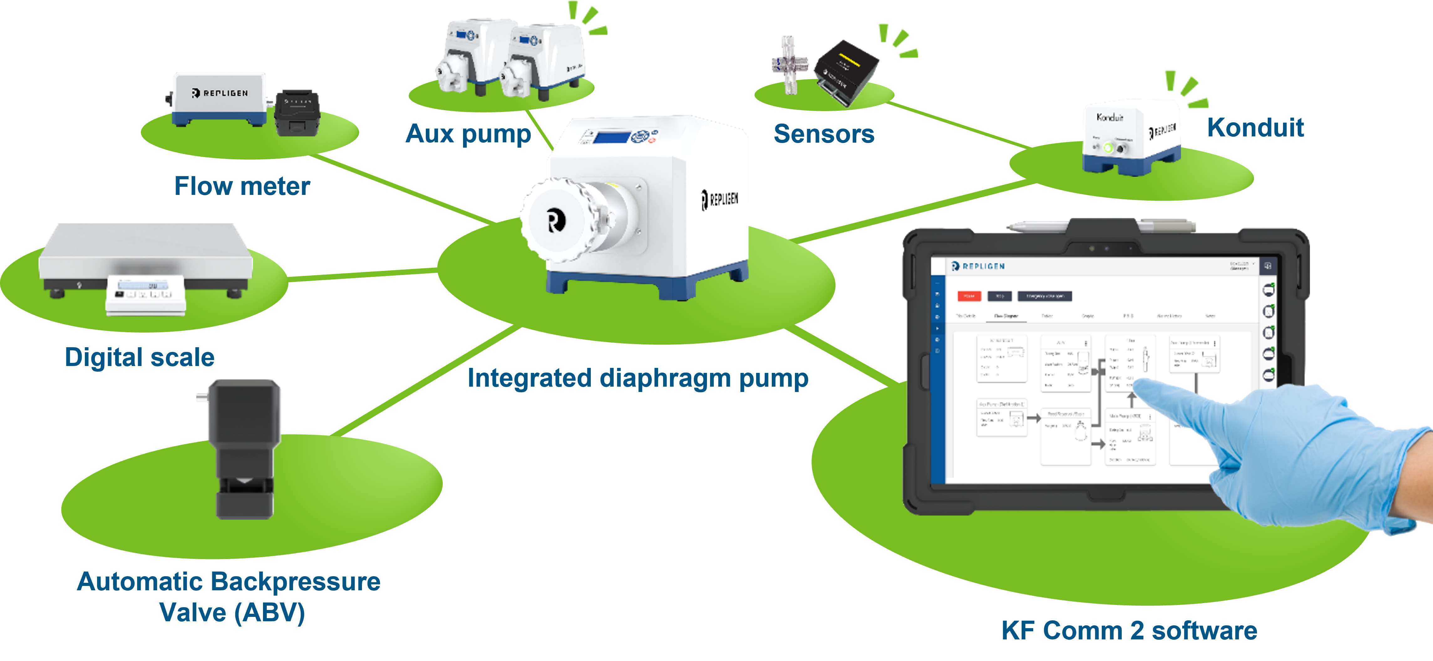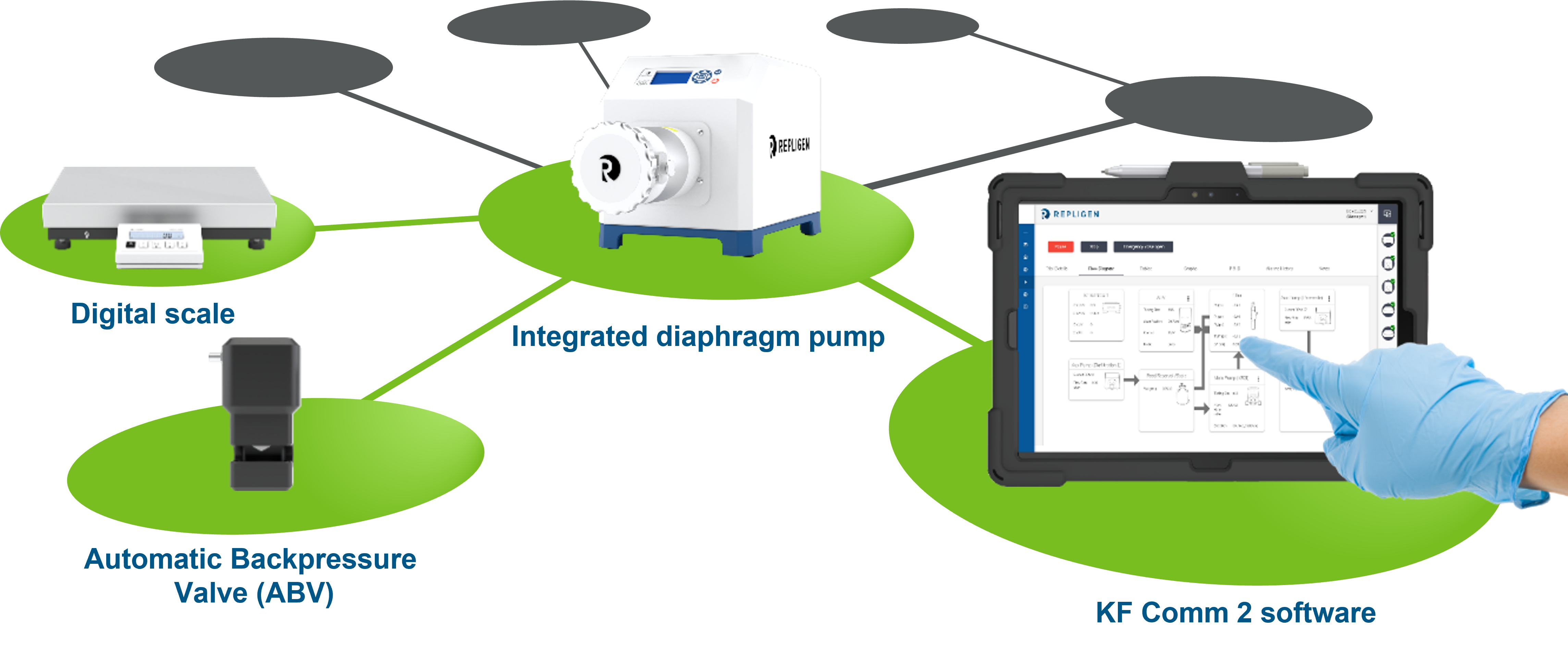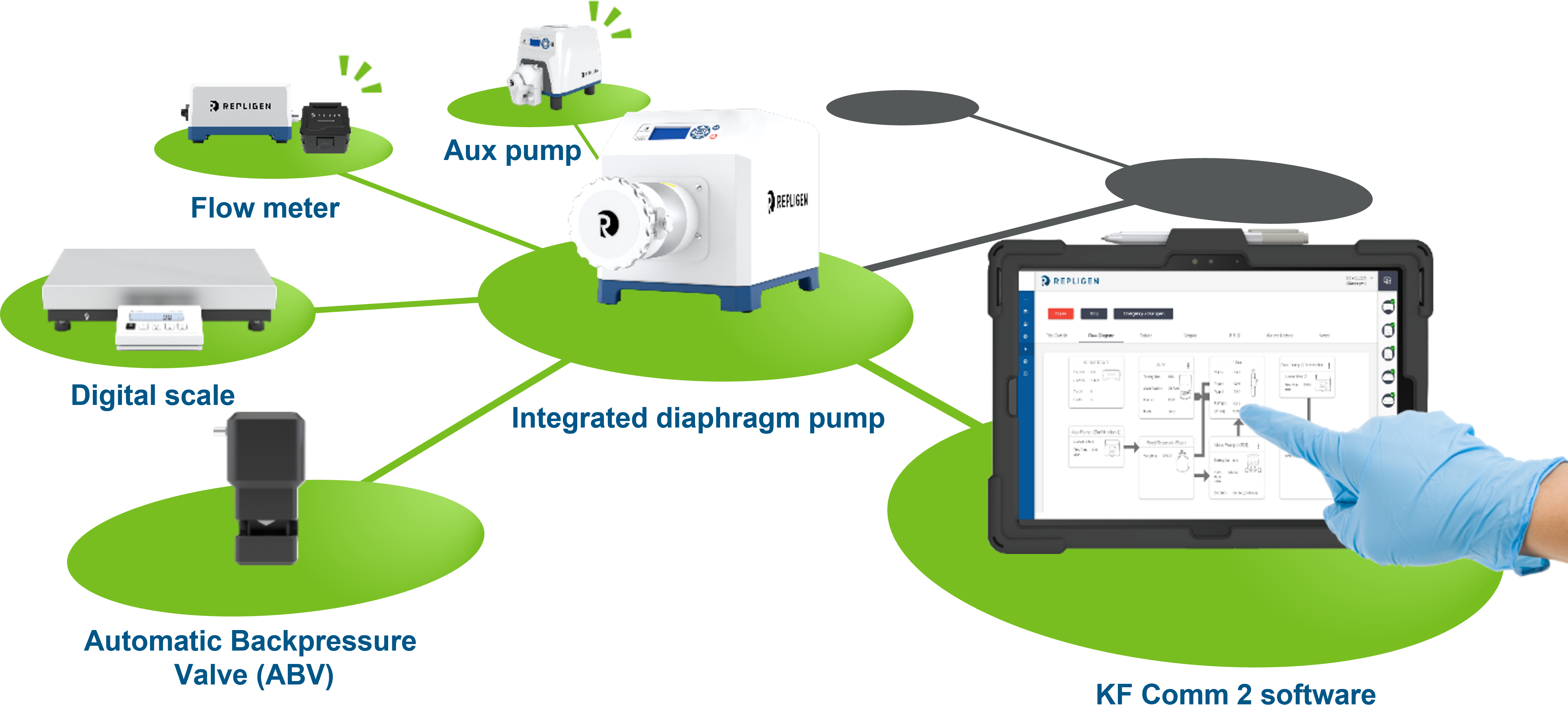 The KrosFlo® FS Systems achieve an unparalleled combination of configurability and automation and compliance for flat sheet TFF processes. All components, either directly or indirectly, connect to the main KrosFlo® FS diaphragm pump, which then communicates with the KF Comm 2 software for control and monitoring.