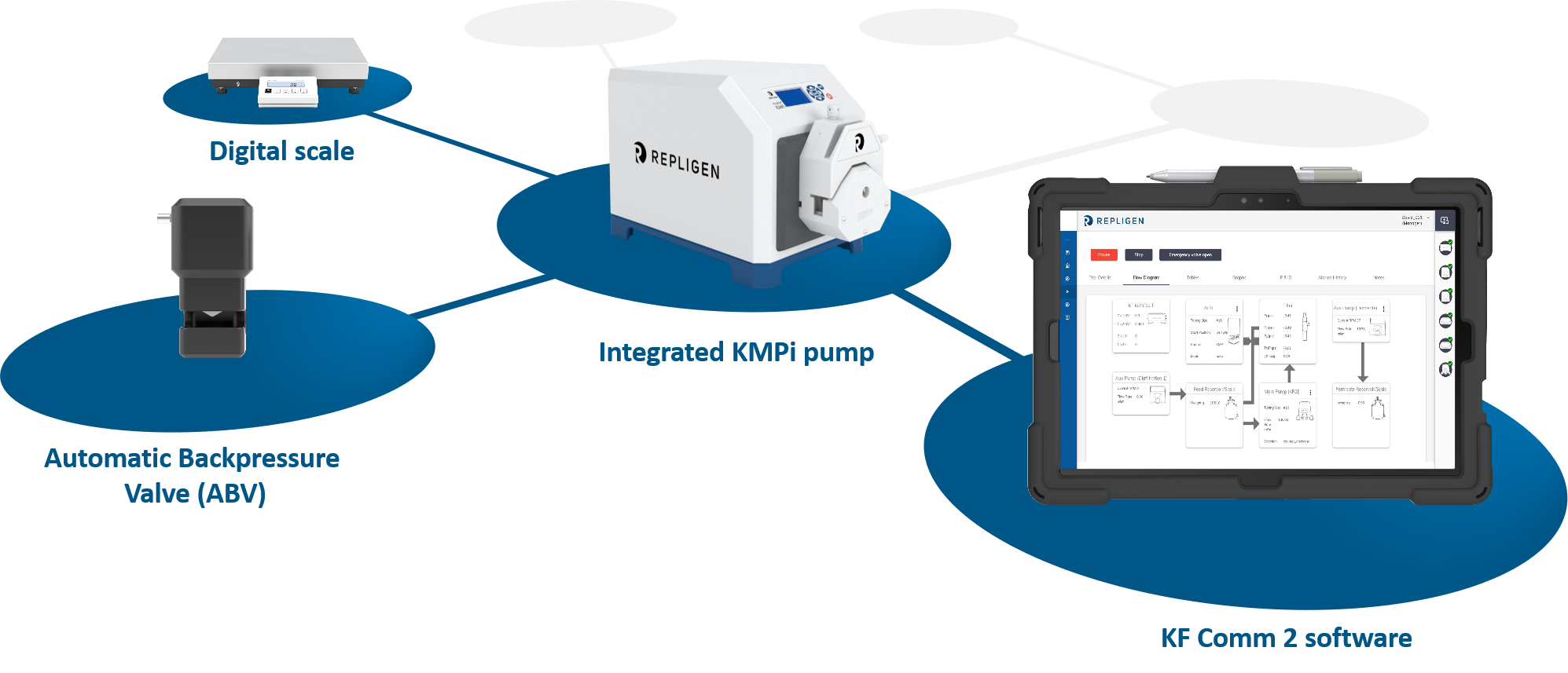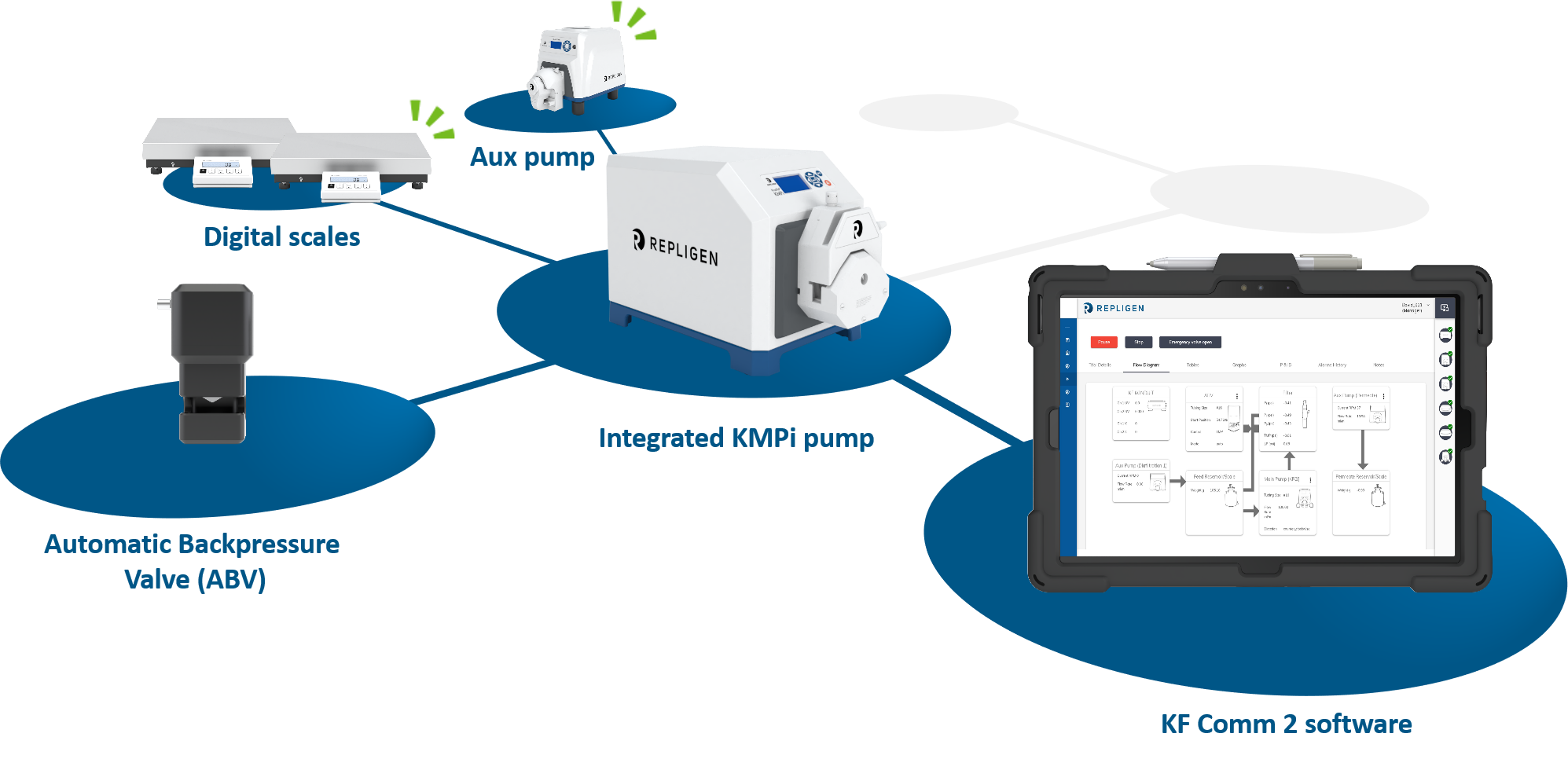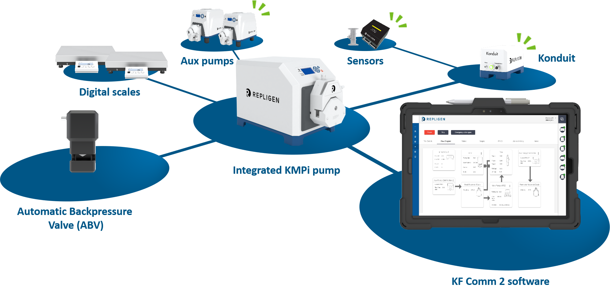 The KrosFlo® KMPi TFF System achieves an unparalleled combination of integration, configurability and automation through modular, plug-and-play hardware. All components, either directly or indirectly, connect to the main KrosFlo® KMPi peristaltic pump, which then communicates with the KF Comm 2 software for control and monitoring.