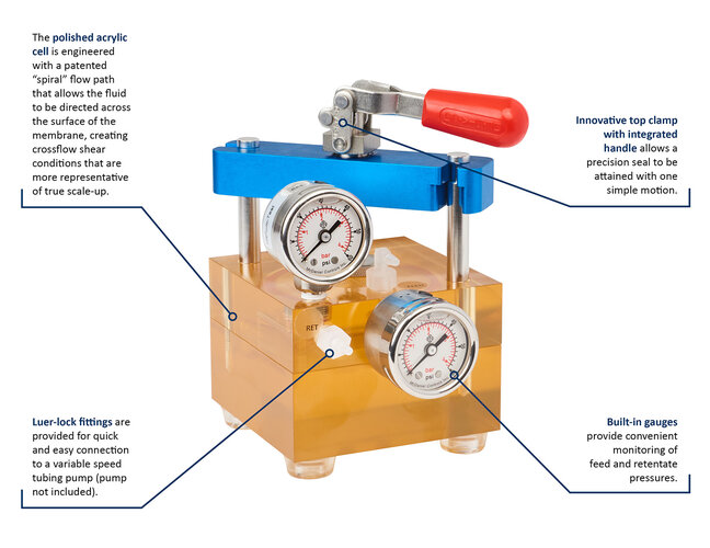 In the X-Flo76 System, a patented spiral flow path allows fluid to be directed across the surface of the membrane, creating cross-flow shear conditions that are more representative of true scale-up. Unlike traditional stirred cells, the X-Flo76 uses a pump as the filtration driving force for better TMP control and optimal scale-up performance. Watch the video to see the XFlo-76 System in operation.