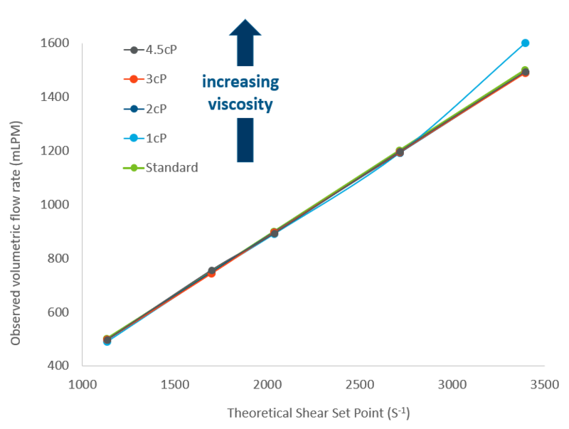 - Overlapping lines demonstrate that the correlation between volumetric flow rate and shear set point remains consistent with increasing viscosity.