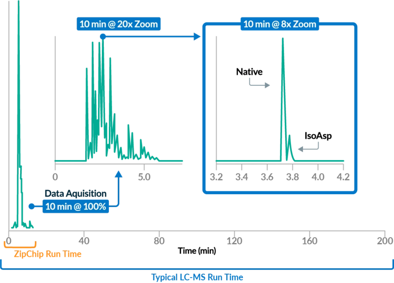 Compared with LC-MS, ZipChip CE-MS can be up to 20x faster, with higher sequence coverage, and comparable quantitation for a panel of 15 CQAs including deamidation, aspartic acid isomerization, methionine oxidation, and tryptophan oxidation.