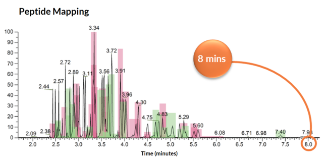 Peptide Mapping – Profiling of complete enzymatic protein digestion in ~10 minutes with 95-100% sequence coverage.
